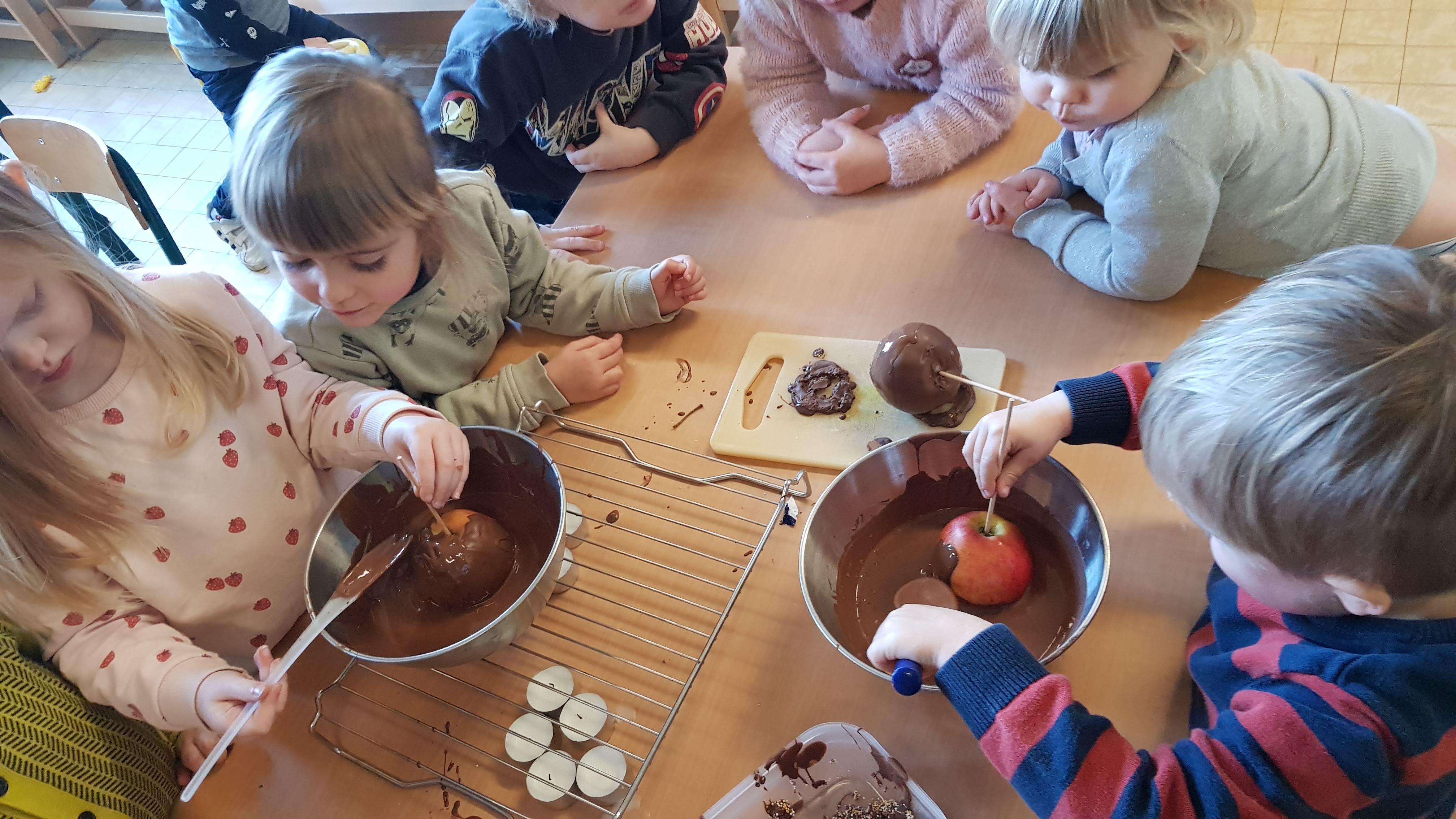 Gezellig aan de tafel in de poppenhoek, net als de zeven dwergen.